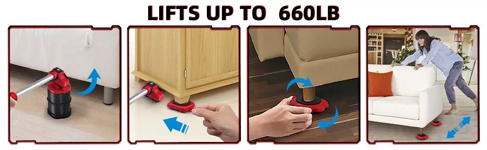 ערכת הרמה והזזה מקצועית לרהיטים כבדים, כוללת מנוף איכותי ו-4 משטחי הזזה עם גלגלים חזקים.